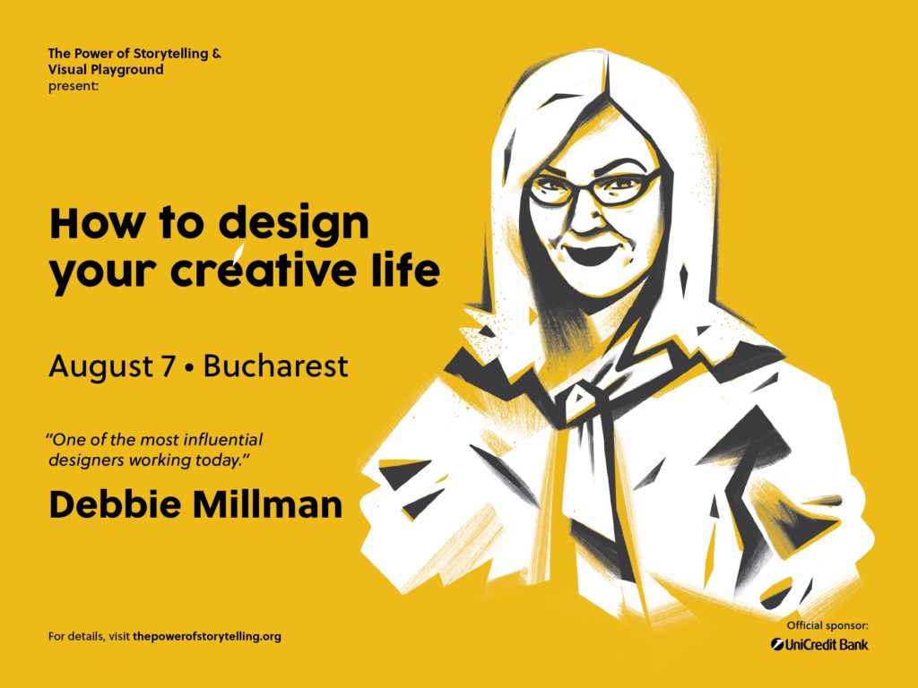 Debbie will address all of these, as well as talk about how we can all be designers of our creative lives during a one-night-only special event hosted by The Power of Storytelling & Visual Playground on Monday, August 7, at 7 pm, at Sala Studio – National Theatre of Bucharest. Tickets are available through Eventbook.